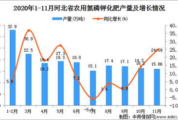 中商情报网讯:据中商产业研究院数据库显示,2020年11月河北省农用氮磷钾化肥产量为15.86万吨,同比增长24.59%。 数据来源:中商产业研究院数据库 2020年11月河北省农用...【详情】