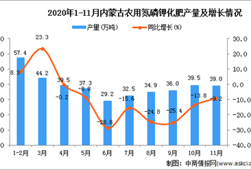 中商情报网讯:据中商产业研究院数据库显示,2020年11月内蒙古自治区农用氮磷钾化肥产量为39万吨,同比下降9.2%。 数据来源:中商产业研究院数据库 2020年11月内蒙古自...【详情】