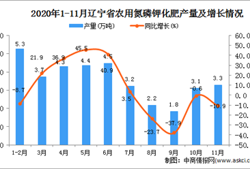中商情报网讯:据中商产业研究院数据库显示,2020年11月辽宁省农用氮磷钾化肥产量为3.3万吨,同比下降10.9%。 数据来源:中商产业研究院数据库 2020年11月辽宁省农用氮...【详情】