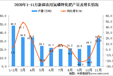 中商情报网讯:据中商产业研究院数据库显示,2020年11月新疆农用氮磷钾化肥产量为33.43万吨,同比增长23.7%。 数据来源:中商产业研究院数据库 2020年11月新疆农用氮磷...【详情】