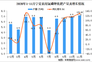 中商情报网讯:据中商产业研究院数据库显示,2020年11月宁夏农用氮磷钾化肥产量为7.1万吨,同比增长129.68%。 数据来源:中商产业研究院数据库 2020年11月宁夏农用氮磷...【详情】