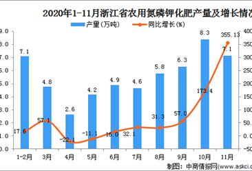 中商情报网讯:据中商产业研究院数据库显示,2020年11月浙江省农用氮磷钾化肥产量为7.1万吨,同比增长355.13%。 数据来源:中商产业研究院数据库 2020年11月浙江省农用...【详情】