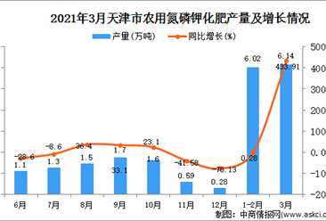 中商情报网讯:据中商产业研究院数据库显示,2021年3月天津市农用氮磷钾化肥产量为6.14万吨,同比增长为433.91% 数据来源:中商产业研究院数据库 2021年3月天津市农用氮...【详情】