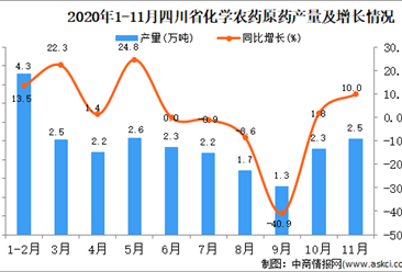 中商情报网讯:据中商产业研究院数据库显示,2020年11月四川省化学农药原药产量为2.5万吨,同比增长10%。 数据来源:中商产业研究院数据库 2020年11月四川省化学农药原...【详情】