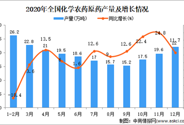 中商情报网讯:据中商产业研究院数据库显示,2020年12月全国化学农药原药产量为22万吨,同比增长11.7%。 数据来源:中商产业研究院数据库 2020年全国化学农药原药产量统...【详情】