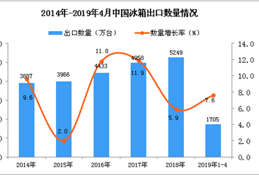 中商情报网讯:据中商产业研究院数据库显示,2018年3-4季度全国家用电冰箱产量有小幅度下降,2019年4月全国家用电冰箱产量为771.2万台,同比增长2.1%。2019年1-4月全国家...【详情】