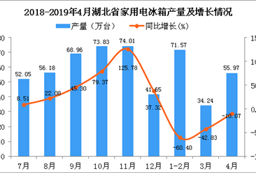 中商情报网讯:据中商产业研究院数据库显示,2018年3-4季度湖北省家用电冰箱产量逐渐增长,2019年4月湖北省家用电冰箱产量为55.97万台,同比下降10.07%。2019年1-4月湖北...【详情】