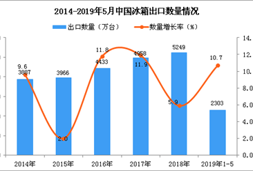 中商情报网讯:据中商产业研究院数据库显示,2014-2018年中国冰箱出口量逐步增长,2019年1-5月中国冰箱出口量为2303万台,同比增长10.7%。 数据来源:中商产业研究院数...【详情】
