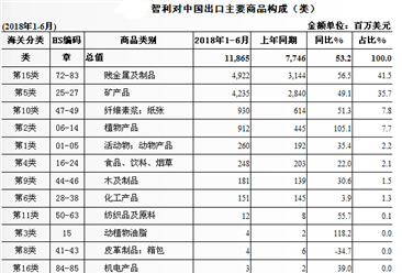 中商情报网讯:据智利海关统计,2018年1-6月,智利货物进出口额为720.0亿美元,比上年同期(下同)增长21.6%。其中,出口389.9亿美元,增长26.2%;进口330.1亿美元,增长1...【详情】