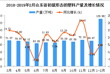 中商情报网讯:据中商产业研究院数据库显示,2018年1-4季度山东省初级形态的塑料产量呈震荡上行;2019年1-2月山东省初级形态的塑料产量为129.98万吨,同比增长4.82%。 ...【详情】