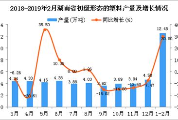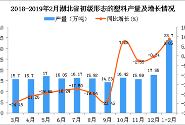 中商情报网讯:据中商产业研究院数据库显示,2018年1-4季度湖北省初级形态的塑料产量呈震荡上行;2019年1-2月湖北省初级形态的塑料产量为33.7万吨,同比增长8.85%。 数...【详情】