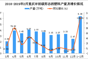 中商情报网讯:据中商产业研究院数据库显示,2018年2-4季度重庆市初级形态的塑料产量逐渐下降,2019年1-2月重庆市初级形态的塑料产量为6.38万吨,同比增长119.24%。 数...【详情】