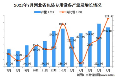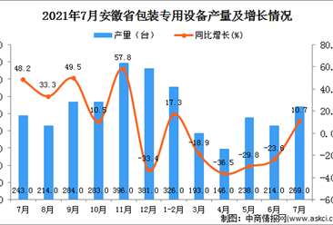 中商情报网讯:据中商产业研究院数据库显示,2021年7月安徽省包装专用设备269台,同比增长10.7%。 数据来源:中商产业研究院数据库 2021年7月安徽省包装专用设备增长情...【详情】