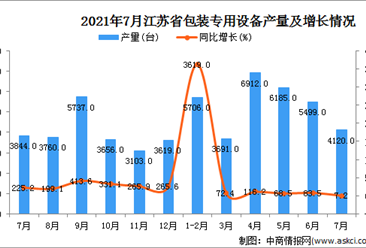 中商情报网讯:据中商产业研究院数据库显示,2021年7月江苏省包装专用设备4120台,同比上升7.2%。 数据来源:中商产业研究院数据库 2021年7月江苏省包装专用设备增长情...【详情】