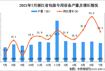 中商情报网讯:据中商产业研究院数据库显示,2021年7月浙江省包装专用设备2673台,同比增长29.3%。 数据来源:中商产业研究院数据库 2021年7月浙江省包装专用设备增长情...【详情】