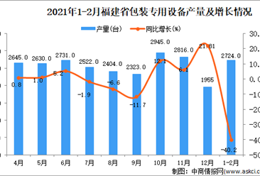 中商情报网讯:据中商产业研究院数据库显示,2021年1-2月福建省包装专用设备产量为2724台,同比下降40.2%。 数据来源:中商产业研究院数据库 2021年1-2月福建省包装专用...【详情】