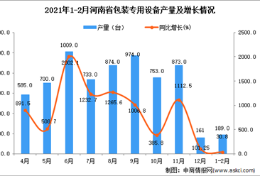 中商情报网讯:据中商产业研究院数据库显示,2021年1-2月河南省包装专用设备产量为189台,同比增长30.8%。 数据来源:中商产业研究院数据库 2021年1-2月河南省包装专用...【详情】