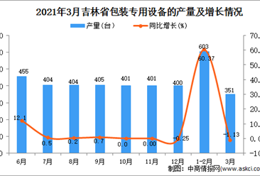 中商情报网讯:据中商产业研究院数据库显示,2021年3月吉林省包装专用设备产量为351台,同比下降为1.13% 数据来源:中商产业研究院数据库 2021年3月吉林省包装专用设备...【详情】