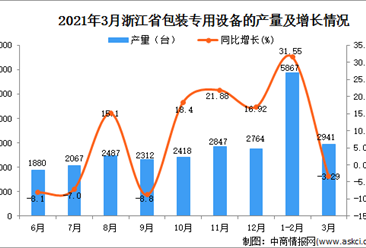 中商情报网讯:据中商产业研究院数据库显示,2021年3月浙江省包装专用设备产量为2941台,同比下降为3.29% 数据来源:中商产业研究院数据库 2021年3月浙江省包装专用设备...【详情】