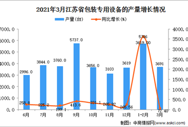 中商情报网讯:据中商产业研究院数据库显示,2021年3月江苏省包装专用设备产量为3691台,同比增长为72.40% 数据来源:中商产业研究院数据库 2021年3月江苏省包装专用设...【详情】