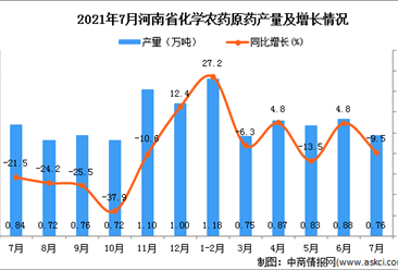 中商情报网讯:据中商产业研究院数据库显示,2021年7月河南省化学农药原药0.76万吨,同比下降9.5%。 数据来源:中商产业研究院数据库 2021年7月河南省化学农药原药增长...【详情】