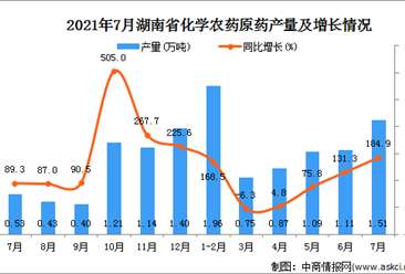 中商情报网讯:据中商产业研究院数据库显示,2021年7月湖南省化学农药原药1.51万吨,同比增长184.9%。 数据来源:中商产业研究院数据库 2021年7月湖南省化学农药原药增...【详情】