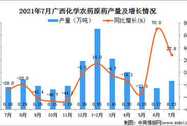 中商情报网讯:据中商产业研究院数据库显示,2021年7月广西壮族自治区化学农药原药0.23万吨,同比增长27.8%。 数据来源:中商产业研究院数据库 2021年7月广西壮族自治区...【详情】
