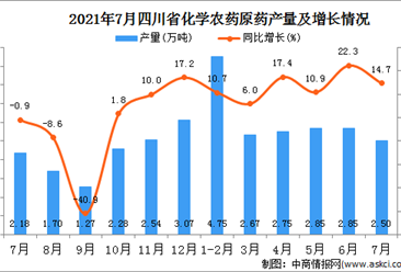 中商情报网讯:据中商产业研究院数据库显示,2021年7月四川省化学农药原药2.5万吨,同比增长14.7%。 数据来源:中商产业研究院数据库 2021年7月四川省化学农药原药增长...【详情】