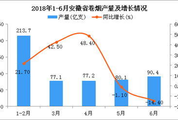 中商情报网讯:据中商产业研究院数据库显示,2018年3月-6月安徽省卷烟产量逐渐增长,2018年6月安徽省卷烟产量为90.4亿支,同比下降14.4%;相较3月,6月安徽省卷烟产量增长...【详情】