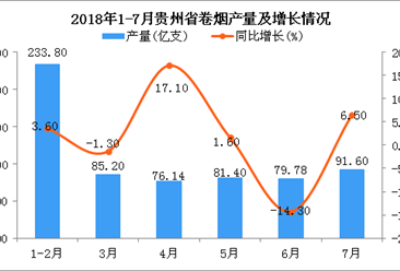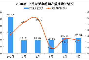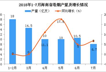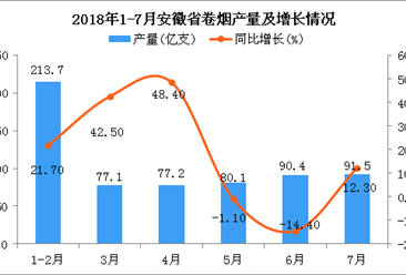 中商情报网讯:据中商产业研究院数据库显示,2018年3-7月安徽省卷烟产量稳步增长,2018年7月安徽省卷烟产量为91.5亿支,同比增长12.3%。2018年1-7月安徽省卷烟产量为630亿...【详情】