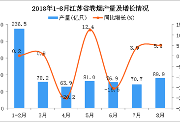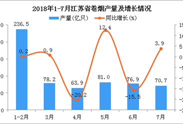 中商情报网讯:据中商产业研究院数据库显示,2018年3-4月江苏省卷烟产量下降,2018年4月江苏省卷烟产量为63.9亿只,同比下降20.2%。2018年5-7月江苏省卷烟产量呈小幅度下...【详情】