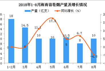中商情报网讯:据中商产业研究院数据库显示,2018年3月-5月海南省卷烟产量逐渐下降,2018年5月海南省卷烟产量为10亿支,同比增长17.6%。2018年6月海南省卷烟产量有小幅度...【详情】