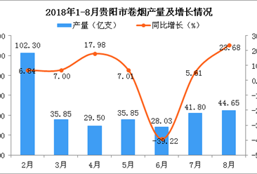 中商情报网讯:据中商产业研究院数据库显示,2018年1月-4月贵阳市卷烟产量呈下降趋势,2018年4月贵阳市卷烟产量为29.5亿支,同比增长18%。2018年6-8月贵阳市卷烟产量逐渐...【详情】