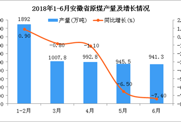 中商情报网讯:据中商产业研究院数据库显示,2018年3月-6月安徽省原煤产量逐渐下降,2018年6月安徽省原煤产量为941.3万吨,同比下降7.4%。2018年1-6月安徽省原煤累计产量...【详情】