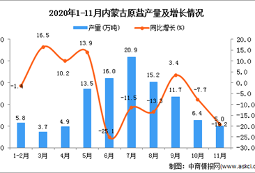 中商情报网讯:据中商产业研究院数据库显示,2020年11月内蒙古自治区原盐产量为5万吨,同比下降19.2%。 数据来源:中商产业研究院数据库 2020年11月内蒙古自治区原盐产...【详情】