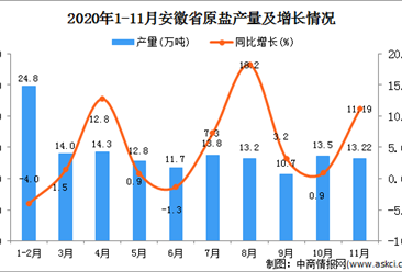 中商情报网讯:据中商产业研究院数据库显示,2020年11月安徽省原盐产量为13.22万吨,同比增长11.19%。 数据来源:中商产业研究院数据库 2020年11月安徽省原盐产量增长情...【详情】