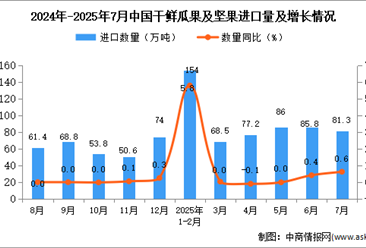中商情报网讯:据中商产业研究院数据库显示,2025年7月中国干鲜瓜果及坚果进口量81.3万吨,同比增长0.6%;1-7月中国干鲜瓜果及坚果进口量557.5万吨,同比增长13.2%。 数...【详情】