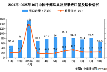 中商情报网讯:据中商产业研究院数据库显示,2025年10月中国干鲜瓜果及坚果进口量65.6万吨,同比增长0.2%;1-10月中国干鲜瓜果及坚果进口量782.2万吨,同比增长15.6%。 ...【详情】