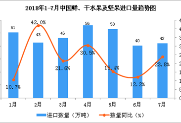 中商情报网讯:据中商产业研究院数据库显示,2018年8-10月中国鲜、干水果及坚果进口量呈下降趋势,2018年10月中国鲜、干水果及坚果进口量下降幅度加大;2018年11月中国鲜...【详情】