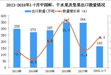 中商情报网讯:据中商产业研究院数据库显示,2013年-2015年中国鲜、干水果及坚果进口量持续增长,增长37.83%。2018年中国鲜、干水果及坚果进口量相比2013年增长253万吨。2...【详情】
