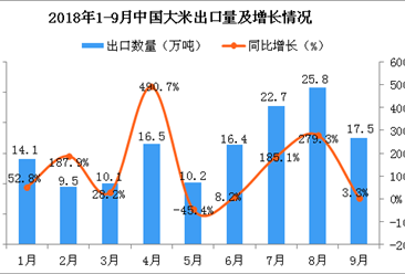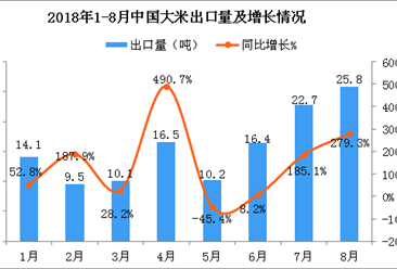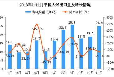 中商情报网讯:据中商产业研究院数据库显示,2018年9-11月中国大米出口量大幅度增长,2018年11月中国大米出口量维持增长趋势;2018年11月中国大米出口量为24.9万吨,同比...【详情】