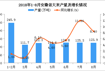 中商情报网讯:据中商产业研究院数据库显示,2018年3-9月安徽省大米产量波动幅度不大,2018年9月安徽省大米产量有所增长;2018年9月安徽省大米产量为131.6万吨,同比增长8...【详情】