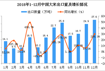 中商情报网讯:据中商产业研究院数据库显示,2018年1-4季度中国大米出口量呈增长趋势,其中,2018年3季度中国大米出口量增幅最大,相比2季度增长22.9%。2018年12月中国大...【详情】