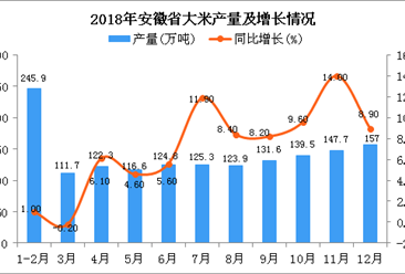 中商情报网讯:据中商产业研究院数据库显示,2018年3-4月安徽省大米产量有所增长,2018年4月安徽省大米产量为122.3万吨,同比增长6.1%。2018年5月安徽省大米产量有所下降...【详情】