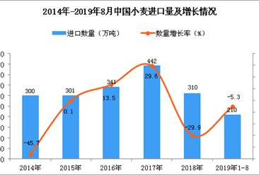 中商情报网讯:据中商产业研究院数据库显示,2019年1-2季度中国小麦进口量有所下降,2019年1-8月中国小麦进口量为210万吨,同比下降5.3%。 数据来源:中商产业研究院数...【详情】