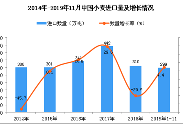 中商情报网讯:据中商产业研究院数据库显示,2014-2017年中国小麦进口量逐渐增长,2018年中国小麦进口量下降;2019年1-11月中国小麦进口量为299万吨,同比增长4.4%。 数...【详情】