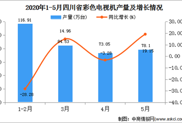 中商情报网讯:据中商产业研究院数据库显示,2020年5月四川省彩色电视机产量下降,2020年5月四川省彩色电视机产量为78.1万台,同比增长19.15%。2020年1-5月四川省彩色电...【详情】