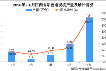 中商情报网讯:据中商产业研究院数据库显示,2020年6月江西省彩色电视机产量增长,2020年6月江西省彩色电视机产量为7.27万台,同比增长560.91%。2020年6月江西省彩色电视...【详情】