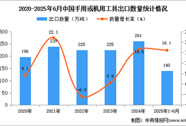 2025年1-6月中国手用或机用工具出口数据统计分析:出口量同比增长16.1%