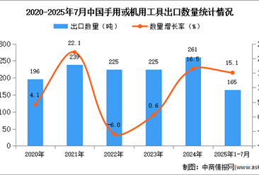2025年1-7月中国手用或机用工具出口数据统计分析:出口量同比增长15.1%